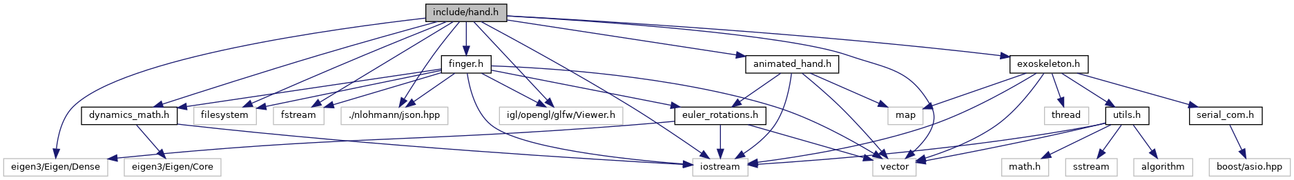 #include <iostream>#include <vector>#include <filesystem>#include <fstream>#include <eigen3/Eigen/Dense>#include "./nlohmann/json.hpp"#include <igl/opengl/glfw/Viewer.h>#include "dynamics_math.h"#include "exoskeleton.h"#include "animated_hand.h"#include "finger.h"