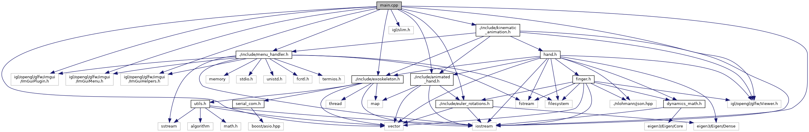 #include <iostream>#include <vector>#include <igl/opengl/glfw/Viewer.h>#include <igl/opengl/glfw/imgui/ImGuiPlugin.h>#include <igl/opengl/glfw/imgui/ImGuiMenu.h>#include <igl/opengl/glfw/imgui/ImGuiHelpers.h>#include <igl/slim.h>#include "./include/euler_rotations.h"#include "./include/exoskeleton.h"#include "./include/menu_handler.h"#include "./include/animated_hand.h"#include "./include/kinematic_animation.h"